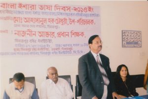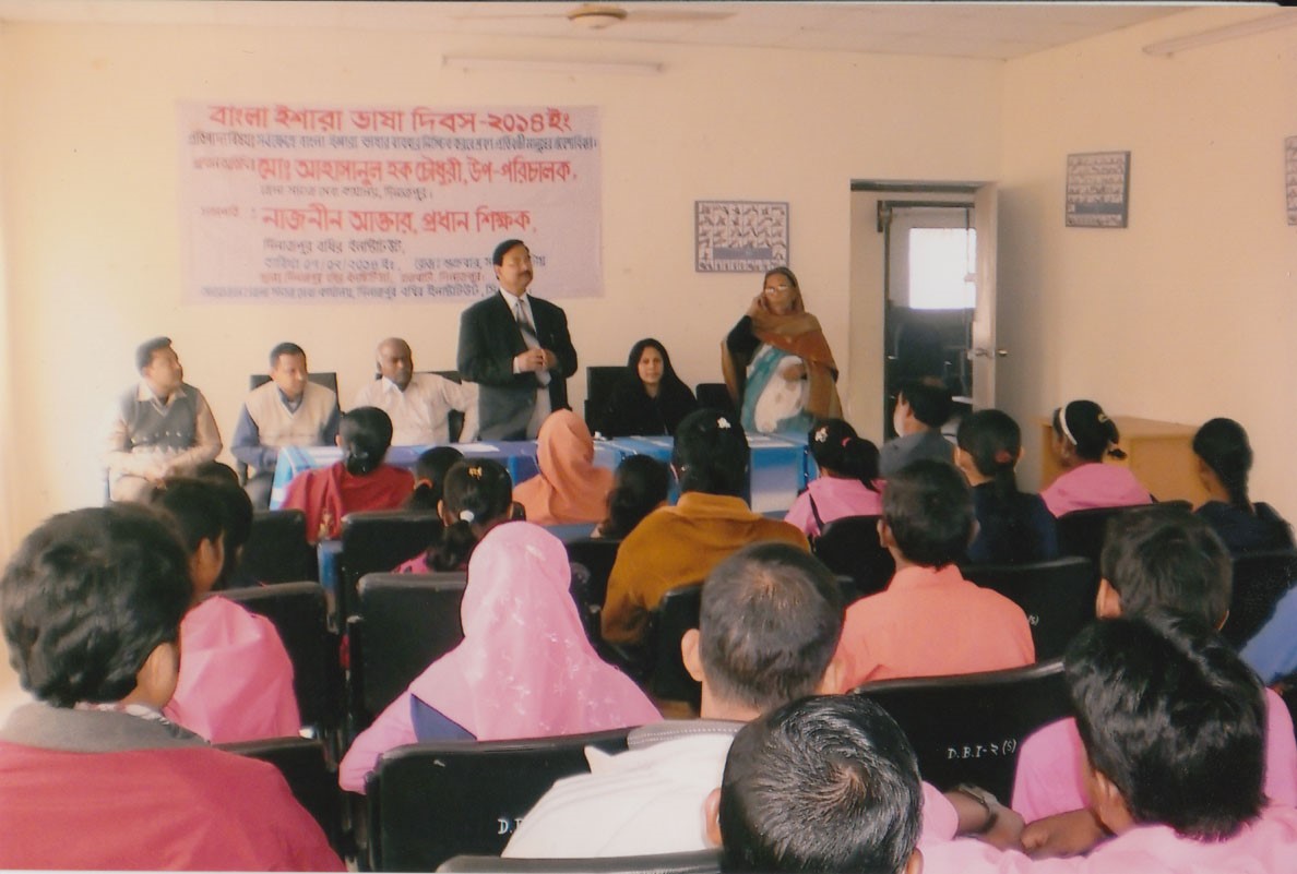 সর্বক্ষেত্রে বাংলা ইশারা ভাষার ব্যবহার-নিশ্চিত করবে শ্রবণ প্রতিবন্ধী মানুষের প্রবেশাধিকার উপপাদ্য বিষয়কে সামনে রেখে দিনাজপুর বধির ইনিস্টিটিউট মিলনায়তনে ৭ ফেব্রুয়ারী ২০১৪ রোজ শুক্রবার সকাল ১০.০০ টায় জেলা সমাজসেবা কার্যালয়, দিনাজপুর, দিনাজপুর বধির ইনিস্টিটিউট, কমিউনিটি ডেভেলপমেন্ট সেন্টার (সিডিসি), দিনাজপুর-এর যৌথ আয়োজনে এক আলোচনা সভা অনুষ্ঠিত হয়। আলোচনা সভায় সভাপতিত্ব করেন নাজনীন আকতার, প্রধান শিক্ষক, দিনাজপুর বধির ইনিস্টিটিউট। প্রধান অতিথি হিসেবে উপস্থিত ছিলেন জেলা সমাজসেবা কার্যালয়ের উপ-পরিচালক জনাব মো: আহাসানুল হক চৌধুরী। বিশেষ অতিথি হিসেবে উপস্থিত ছিলেন দিনাজপুর বধির ইনিস্টিটিউট-এর সহকারী শিক্ষক মো: সুজাউদ্দৌলা, আনন্দ কুমার বিশ্বাস, মোজাহারুল ইসলাম, রাবেয়া বেগম এবং কমিউনিটি ডেভেলপমেন্ট সেন্টার (সিডিসি), দিনাজপুর-এর ডিজএ্যাবিলিটি ইনক্লুশন ফ্যাসিলিটেটর (ডিআইআরএফ) শৈলেন চন্দ্র রায়। আলোচনা সভায় বক্তাগণ বাংলা ইশারা ভাষা দিবস এর তাৎপর্য তুলে ধরে বলেন যে, আমাদের মোট জনগোষ্ঠীর এক বিরাট অংশ বাক ও শ্রবণ প্রতিবন্ধী। তাদের সাথে স্বাভাবিক যোগাযোগ করতে ইশারা ভাষা অত্যন্ত গুরুত্ব বহন করে। বাক ও শ্রবণ প্রতিবন্ধী ব্যক্তিদের সাথে যোগাযোগ উপর্যুক্ত করার জন্য বাংলা ইশারা ভাষা পরিবার থেকে সমাজ, সমাজ থেকে রাষ্ট্রের সকল মানুষকে আয়ত্ত করার মধ্য দিয়ে সংশ্লিষ্ট প্রতিবন্ধী ব্যক্তিদের ভাষাগত অধিকার প্রতিষ্ঠা করা আজ সময়ের দাবি। তাই আসুন সকলেই সংশ্লিষ্ট প্রতিবন্ধী ব্যক্তিদের উন্নয়ন ও অধিকার প্রতিষ্ঠায় একাত্ব হয়ে কাজ করি। আলোচনা সভায় শতাধিক প্রতিবন্ধী ব্যক্তিসহ বিভিন্ন পেশাজীবীর মানুষ অংশগ্রহণ করেন।
