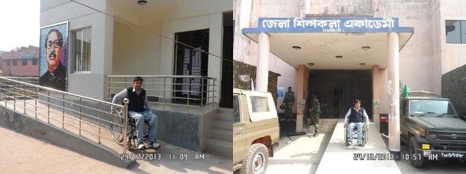 প্রতিবন্ধী ব্যক্তি কর্তৃক পরিচালিত “এসোসিয়েশন ফর পোভার্টি এলীভিয়েশন অব নেইবারস (আপন) এর সার্বিক তত্বাবধানে জেলা শিল্পকলা একাডেমী এবং পাশেই অবস্থিত জেলা মুক্তিযোদ্ধা কমপ্লেক্সে সিঁড়ির পাশে সংযুক্ত করা হয়েছে হুইলচেয়ার প্রবেশগম্য ঢালু পথ। এছাড়া মুক্তিযোদ্ধা কমপ্লেক্সের র্যাম্পটি নির্মিত হয় যুদ্ধাহত মুক্তিযোদ্ধাদের জন্য।