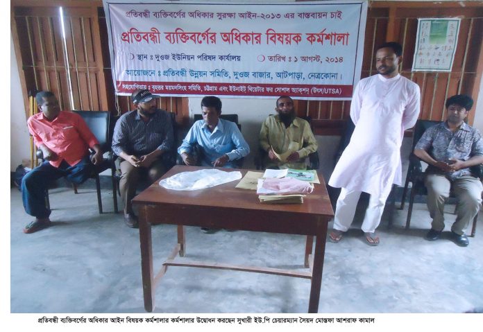নেত্রকোণার আটপাড়া উপজেলায় বসবাসরত ৫৩ জন বিভিন্ন ধরনের প্রতিবন্ধী মানুষের অংশগ্রহণে দুওজ ইউনিয়ন পরিষদ কার্যালয়ে “প্রতিবন্ধী অধিকার আইনের বাস্তবায়ন” শীর্ষক এই কর্মশালা অনুষ্ঠিত হয় গত ১ অগাস্ট’১৪। প্রতিবন্ধী উন্নয়ন সমিতির উদ্যোগে উৎস চট্টগ্রাম এবং বৃহত্তর ময়মনসিংহ সমিতি চট্টগ্রাম-এর সহযোগিতায় এই কর্মশালার উদ্বোধনী অনুষ্ঠানের মাধ্যমে তৃণমূল পর্যায়ে অবস্থানরত প্রতিবন্ধী ব্যক্তিবর্গকে আইন সম্পর্কে সচেতনতা বৃদ্ধি এবং স্ব স্ব অধিকার আদায়ে সচেষ্ট হতে আলোচনা চলে দিনব্যাপী।