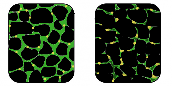 ছবি: আক্রান্ত পেশী টিস্যু (ডানে) বিশৃঙ্খল হয়ে যায় এবং dystrophin (সবুজ) এর ঘনত্ব স্বাভাবিক পেশীর (বামে) তুলনায় ব্যাপকভাবে হ্রাস পায়