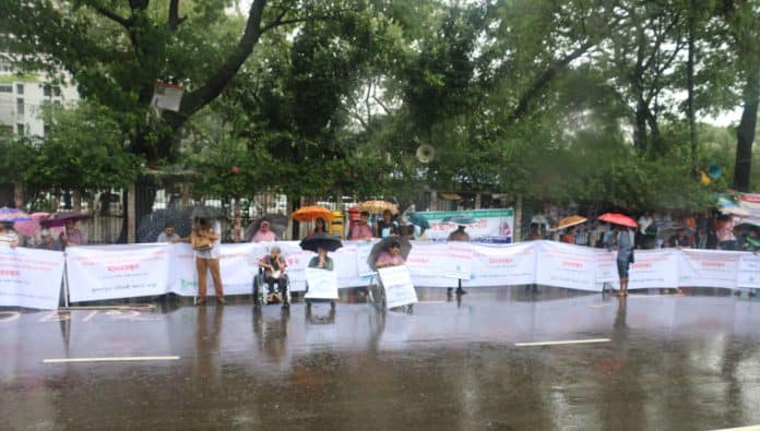 ঝড়-বৃষ্টি মাথায় নিয়ে প্রতিবন্ধী ব্যক্তি সংগঠনের মানববন্ধন সর্বজনীন প্রবেশগম্যতার দাবিতে। ১২ দফা দাবির মধ্যে মূল দাবি ছিল বাংলাদেশ জাতীয় ইমারত নির্মাণ বিধিমালা (বিএনবিসি) অবিলম্বে প্রণয়ন এবং প্রতিবন্ধী মানুষের চাহিদার ভিন্নতা বিবেচনায় তা দ্রুত বাস্তবায়ন।