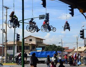 বিক্ষোভকারীরা বিভিন্ন ওভারব্রিজ থেকে দড়ি দিয়ে হুইলচেয়ার বেঁধে নিজেদের দীর্ঘ সময় ঝুলিয়ে রাখে সবার নজর কাড়তে। যারা গুরুতর প্রতিবন্ধী ব্যক্তি, প্রতি বছর ১০০০ বলিভিয়ানোস করে পাবার যোগ্য, তারা বলেন, মৌলিক প্রয়োজন মেটানোর জন্য যা খুব অপর্যাপ্ত; যেমন খাবার ও ডায়াপার। তাই আমরা অনেক বিক্ষোভকারী প্রতীকি হিসেবে ডায়াপার পরে প্রতিবাদ জানিয়েছি। কেউ শরীরের পেছনে ক্রশ বেঁধে হেঁটে চলেছে, কেউ দেশের পতাকা এবং বিভিন্ন দাবিসংবলিত পোস্টার নিয়ে।