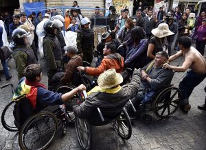 দাবি তাদের সামান্যই। ভাতা বৃদ্ধি করে দেওয়া হোক। নইলে আর যে চলছে না। বর্ধিত সরকারি ভাতা বৃদ্ধির দাবিতে বলিভিয়ায় অতি সাম্প্রতিক সময়ে লাগাতার ছয় মাস ধরে আন্দোলন চালিয়েছে প্রতিবন্ধী মানুষেরা। প্রতিবাদে মুখর হয়ে ওঠে বলিভিয়ার বিভিন্ন গুরুত্বপূর্ণ সড়কগুলো। শুধু ডায়াপার পরে হামাগুড়ি দিয়ে রাস্তায় নেমে আসে তারা। শরীরে বিভিন্ন দাবি লিখে সরকারের দৃষ্টি আকর্ষণের চেষ্টা চালায়। একপর্যায়ে তাদের থামাতে দাঙ্গা পুলিশ নামানো হয়। নিক্ষেপ করা হয় ক্ষতিকর একধরনের বিষাক্ত গ্যাস। জলকামানের তীব্রতায় ছিটকে যায় শত শত প্রতিবন্ধী মানুষের দল। পুলিশের সঙ্গে ধাক্কাধাক্কি করে তবু তারা নানা দিক থেকে আপ্রাণ চেষ্টা চালায় প্রেসিডেন্ট ভবনের দিকে যাওয়ার জন্য। এতে প্রতিবন্ধী মানুষেরা গুরুতর আহত হয়। কিছু পুলিশও আহত হয়।
