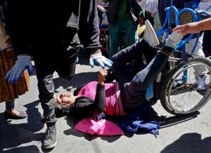 তাদের সেই মিছিল ছত্রভঙ্গ করতে পেপার স্প্রে (গোলমরিচের গুঁড়া দিয়ে মিশ্রিত একধরনের বিষাক্ত গ্যাস, যা চোখে জ্বালা করে ও শ্বাসনালি দিয়ে ফুসফুসে পৌঁছে ক্ষতি করে।) জলকামান ব্যবহার করা হয় এবং ইলেকট্রিক শক দেওয়া হয়। যখন প্রতিবন্ধী বিক্ষোভকারীদের পিটিয়ে মাটিতে ফেলে দেওয়া হচ্ছিল, তখন একজন প্রতিবন্ধী নারী বিক্ষোভকারী বলছিলেন, আমরা শুধু প্রতিবন্ধী ব্যক্তি হিসেবে ইভো মোরালেসের কাছে মর্যাদা চেয়েছিলাম এবং দেখুন তিনি কী করছেন… আমাদের আহত এবং দুর্ব্যবহার করা হচ্ছে। অপর এক নারী মারিকা, যিনি তিরিশ বছর ধরে হুইলচেয়ার ব্যবহার করছেন, তিনি বলেন, দীর্ঘ এই যাত্রায় পথিমধ্যে আমরা কখনো কফি ও রুটি খেয়েছি। কখনো পাস্তা। বিনা মূল্যে রাত কাটানোর জন্য মাথার ওপর ছাদ না পেলে, গাছের নিচে খোলা আকাশের নিচে ঘুমিয়েছি। ন্যায্য অধিকার অর্জনের জন্য এই আন্দোলনে সব ধরনের প্রতিবন্ধী মানুষই স্বতঃস্ফূর্ত অংশগ্রহণ করেছে।