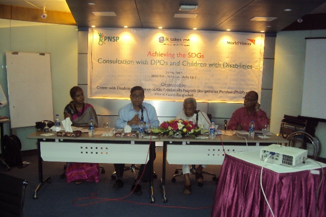 প্রতিবন্ধী ব্যক্তি সংগঠনের প্রতিনিধিদের সঙ্গে ব্র্যাক ইন সেন্টারের সম্মেলনকক্ষে (৩য় তলায়) গত ২৪ মে, ২০১৭ এ সভা অনুষ্ঠিত হয়। পিএনএসপির সভাপতি এম. ওসমান খালেদের সভাপতিত্বে এতে প্রধান অতিথি ছিলেন সাবেক প্রধান বিচারপতি এবং এসডিজিবিষয়ক প্রতিবন্ধী নাগরিক ফোরামের আহ্বায়ক সাবেক প্রধান বিচারপতি ফজলুল করিম এবং বিশেষ অতিথি ছিলেন পরিকল্পনা কমিশনের সিনিয়র সচিব ড. শামসুল আলম। স্বাগত বক্তব্য দেন ওয়ার্ল্ড ভিশনের উপপরিচালক সাবিরা সুলতানা। সভায় মূল প্রবন্ধ উপস্থাপন করেন পিএনএসপি এর পরিচালক রফিক জামান এবং সঞ্চালনা করেন ওয়ার্ল্ড ভিশনের অ্যাডভোকেসি কর্মকর্তা জাহিদুল কবির।