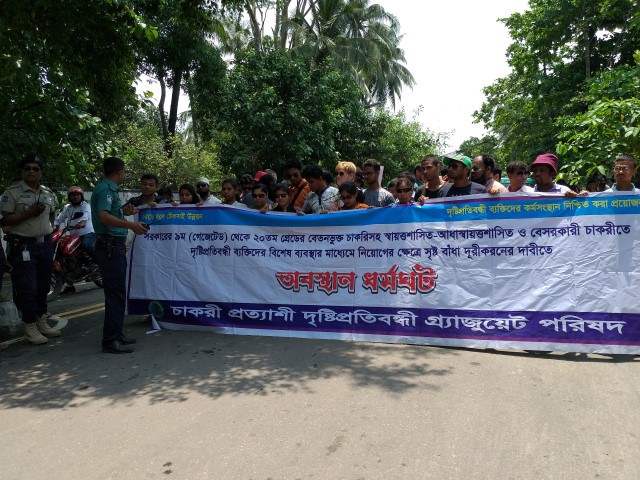 উল্লেখ্য বাংলাদেশ সরকারি কর্ম কমিশন ১০ম গ্রেডভুক্ত ৩৮ নং রিসোর্স শিক্ষক পদের নিয়োগ বিজ্ঞপ্তি দেয় গত ১৭ এপ্রিল। চাকরি প্রত্যাশী দৃষ্টি প্রতিবন্ধী মানুষেরা তা বাতিল করে উক্ত পদে শুধুমাত্র দৃষ্টি প্রতিবন্ধী ব্যক্তিদের নিয়োগের দাবী তুলেন। তাদের মতে দৃষ্টি প্রতিবন্ধী শিক্ষকগণ দৃষ্টি প্রতিবন্ধী শিক্ষার্থীদের পাঠদান দিলেই তা ফলপ্রসু হয়। এছাড়াও সরকারি, স্বায়ত্তশাসিত, আধা-স্বায়ত্তশাসিত এবং বেসরকারি চাকরী পরীক্ষায় ঢাকা বিশ্ববিদ্যালয় শ্রুতি লেখক নীতিমালার ধারা ২৫ এর বি উপধারা অনুযায়ী শ্রুতি লেখক নিয়োগের দাবী জানান তারা। চাকরিতে যোগদানের পূর্ব পর্যন্ত কমপক্ষে দশ হাজার টাকা মাসিক বেকার ভাতা প্রদান এবং মাননীয় প্রধানমন্ত্রীর আশ্বাসের প্রেক্ষিতে বিশেষ ব্যবস্থায় প্রতি বছর প্রতিবন্ধী ব্যক্তিদের চাকরির নিশ্চিয়তায় ছয়টি দাবীতে গত ২৮ এপ্রিল থেকে আন্দোলন করে আসছে।