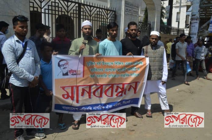 সিলেটের আহবায়ক ইমাম উদ্দিনের সভাপতিত্বে মানববন্ধনে অংশগ্রহণকারী চাকরি প্রত্যাশী